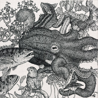 The creatures, drawn almost extemporaneously through daily observation of nature, are intricately intertwined and express the harmony of nature without any boundaries.